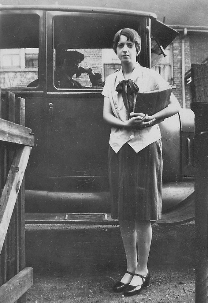 Katheryn Adelaide Campbell (Kay) poses next to the auto as her father, Dr. Emlin Verne Campbell, waits patiently at the wheel in a scene from 1927 or 1928. From what Kay is carrying, it appears she was about to leave for classes of some sort, perhaps at LaSalle Extension University. |
