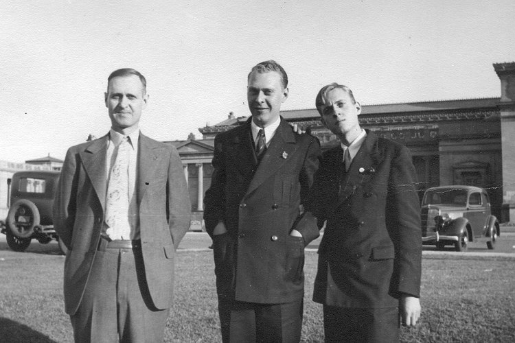 The three Campbell sons — J. Edgar, E. Verne, Jr., and Alan B. — pose before the Museum of Science and Industry in a view apparently taken the same day as the previous photo.