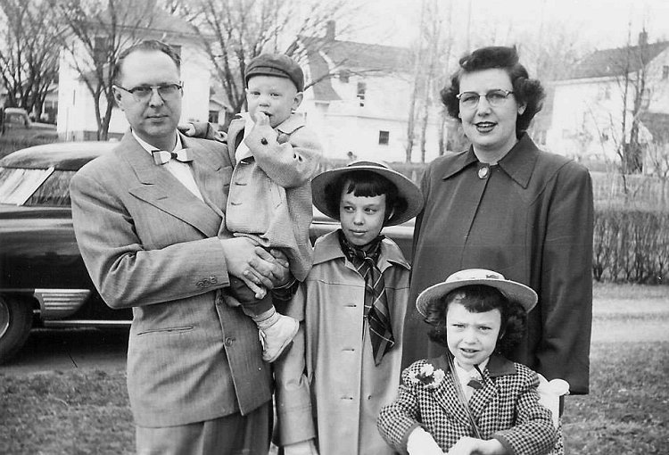 The E. Verne Campbell, Jr. family poses for a photo on Easter Sunday, April 18, 1954. Left to right: Verne holding Paul Verne (born May 3, 1952); Mary Sue; Mary Ruth (Bennett) Campbell; Jean Annette (in front, born March 21, 1948). Location is probably Storm Lake, Iowa. Photo provided by Paul Campbell |